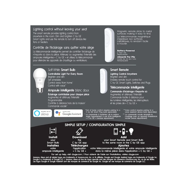 The C by GE Soft White Smart Bulb and Smart Dimmer Remote unlock smart control from anywhere in your house. Use the Dimmer Remote to turn your bulb on and off or dim and brighten to create the perfect dinner time or movie night scene. The remote fits comfortably in your hand and its magnetic back attaches to any metal surface for safe keeping. Use the C by GE app to set scenes and automations, so you can wake up to a dim white light and avoid coming home to a dark house. Pair your remote and smart bulb with C by GE smart plugs and smart switches to enable whole room and out of home control and to unlock voice control with your Google Home or Amazon Alexa device.