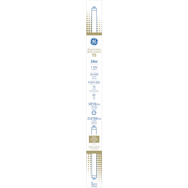 Our 14-Watt T5 Bright White fluorescent bulbs provide bright white light with a neutral colour tone. They provide neutral white multipurpose lighting for a variety of home and commercial spaces. These bulbs are rated to last 13 years based on 6 hour per day consumer use. Use these 21.6-inch long fluorescent bulbs with a 5/8-inch diameter in work spaces at home, offices and commercial buildings.