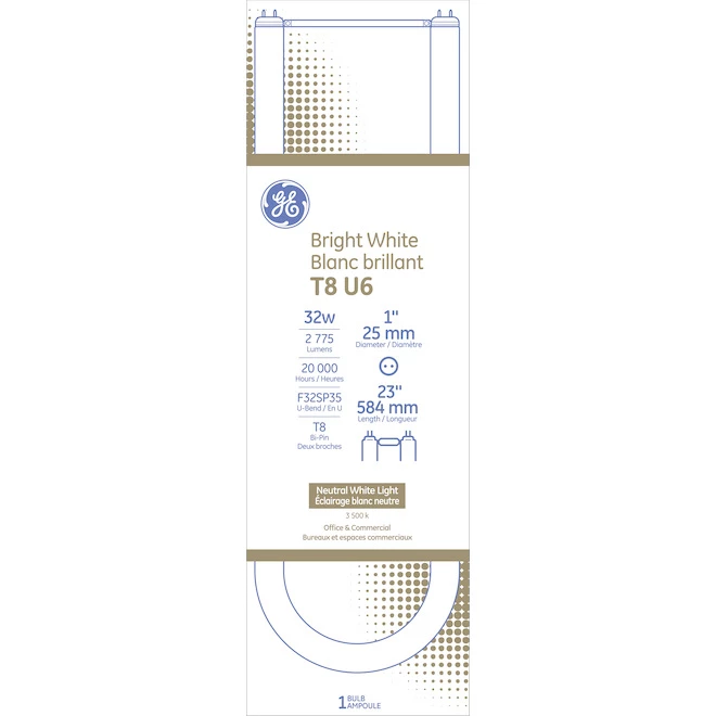 Our 32-Watt T8 U6 Bright White fluorescent bulbs provide bright white light with a neutral colour tone. They provide neutral white multipurpose lighting for a variety of home and commercial spaces. These bulbs are rated to last 8 years based on 6 hour per day consumer use. Use these 22.5-inch long U-Bend fluorescent bulbs with a 1-inch diameter in work spaces at home, offices and commercial buildings.