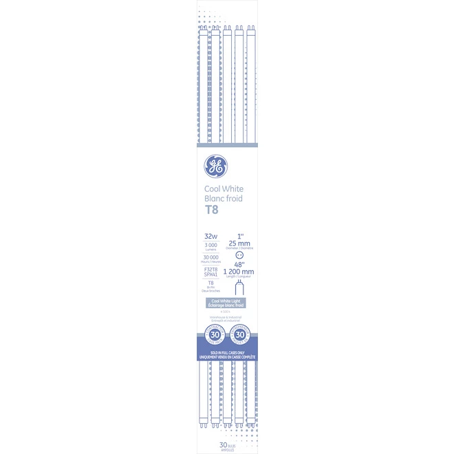 Model Description :GE Cool White 32W Fluorescent 48″ G13 Base T8 Light Bulb (30-Pack)