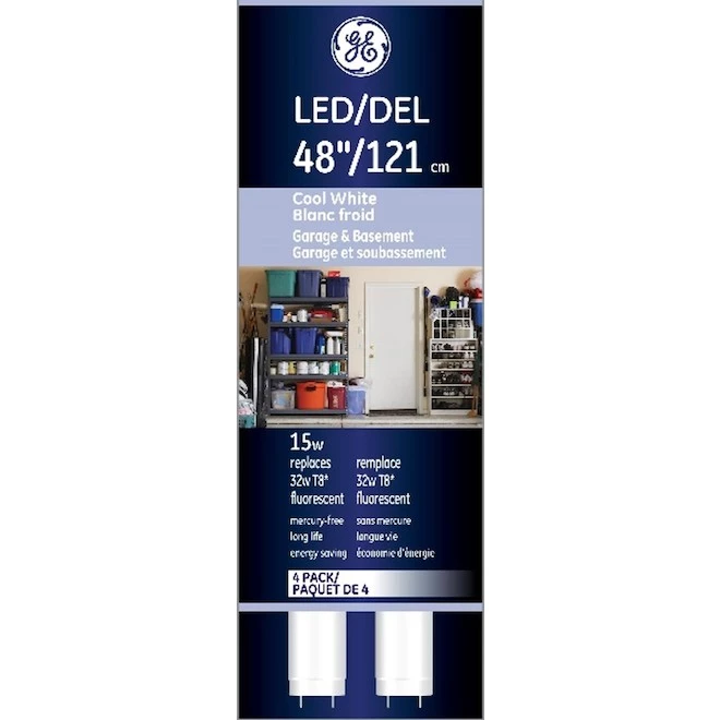 Cool White T8 LED tubes replace 48-inch T8u1-inch diameterufluorescent bulbs using the existing fixture and electronic ballast. It’s slim size fits in the same fixtures as traditional 48-inch T8 fluorescent bulbs. Why make the switch to LED? Our LED tubes are rated to last 36,000 hours. They provide long 16-year life based on six hours use per day, so you’ll replace less often. They use less energy than a 32-Watt T8 with nearly the same light output helping you save money on energy. And they’re mercury free. Use Cool White T8 LED tubes in basements and garages to provide cool, neutral white light.