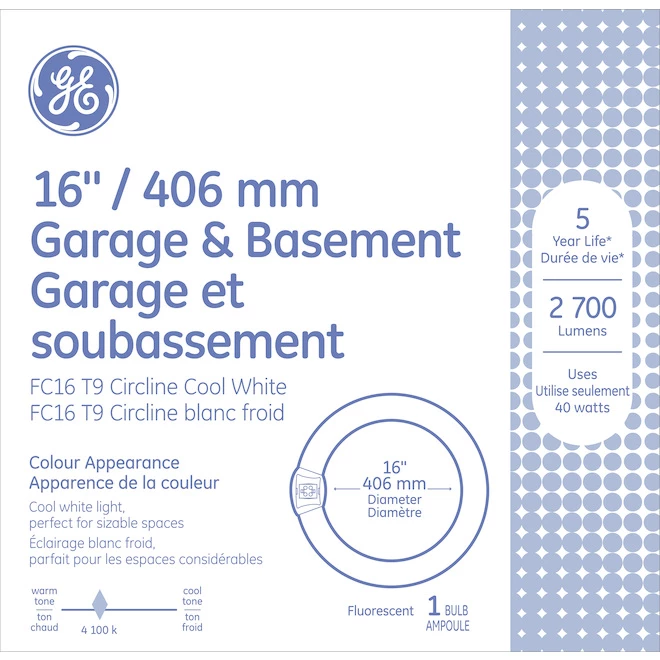 Our 16-inch diameter T9 Garage and Basement Cool White Circline Fluorescent bulbs provide cool, neutral white light. These bulbs are rated to last 5 years based on 6 hour per day consumer use. Use these 16-inch diameter circline fluorescent bulbs in basements, garages and commercial applications like warehouses and industrial buildings.