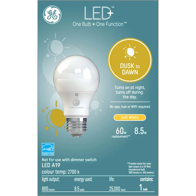 Model Description :GE LED+ Dusk to Dawn Soft White 60W Replacement LED General Purpose A19 Light Bulb (1-Pack)