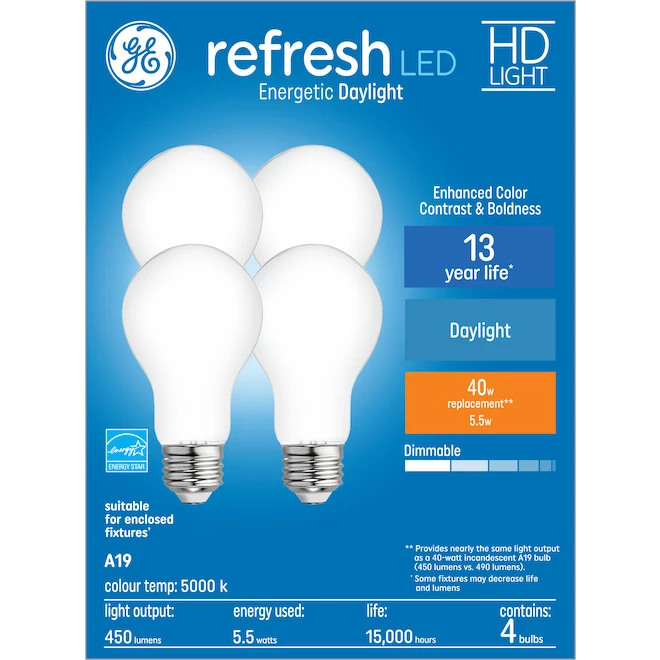 Refresh HD Daylight LED 40-Watt Replacement A19 light bulbs provide enhanced color contrast and boldness versus standard LED bulbs. The high definition daylight light helps create an energetic light that’s ideal for active spaces like playrooms, home offices, laundry rooms, basements and garages. They’re dimmable and illuminate your home with a cool, bluish-white light. These are great for frequently used fixturesuthis Refresh HD Daylight LED bulb is rated to last 13 years and cost just 66 cents to operate each year based on 3 hours use per day at 0.11 per kilowatt hour. Unlike CFL bulbs, LED HD bulbs feature enhanced color, instant full brightness and are free of Mercury. Replace CFL and incandescent light bulbs with Refresh HD Daylight LED general purpose light bulbs in indoor table lamps, sconces and open fixtures, including damp locations.