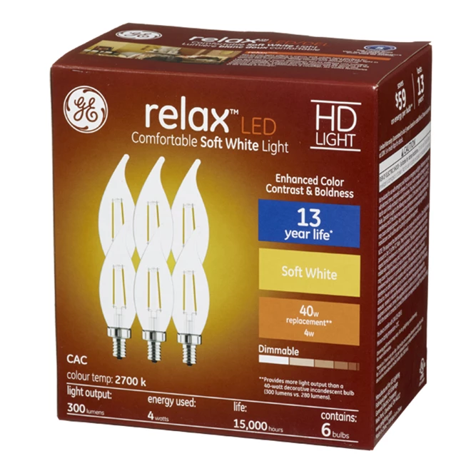 Relax HD Soft White LED 40-Watt Replacement Clear Finish Bent Tip decorative light bulbs provide enhanced color contrast and boldness versus standard LED bulbs. The high definition soft white light helps create a comfortable, cozy light that’s ideal for bedroom lighting, foyer lighting, family rooms and dining rooms. They’re dimmable and illuminate your home with soft white light. These decorative bulbs are great for frequently used fixturesuRelax HD Soft White LED bulbs are rated to last 13 years and save 59 dollars on energy costs over the bulb’s life versus a 40-Watt decorative incandescent bulb. Unlike CFL bulbs, LED HD bulbs feature enhanced color, instant full brightness and are free of Mercury. Replace CFL and incandescent light bulbs with Relax HD Soft White LED Bent Tip (CAC) bulbs with a candelabra base in dimmable indoor chandeliers, sconces and fixtures where the bulb is visible, including damp locations. Bulk LED light bulb 6 pack for residential and commercial use.