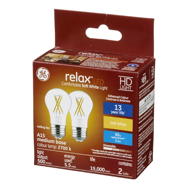 Model Description :GE Relax HD Soft White 60W Replacement LED Clear Ceiling Fan Medium Base A15 Light Bulbs (2-Pack)