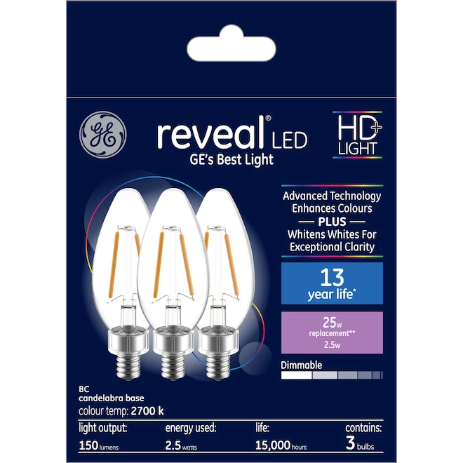 Model Description :GE Reveal HD+ Color-Enhancing 25W Replacement LED Decorative Clear Blunt Tip Candelabra Base BC Light Bulbs (3-Pack)