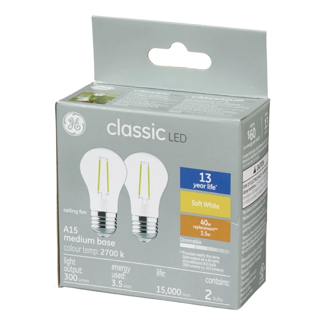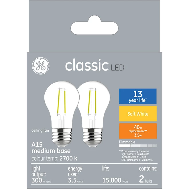 Model Description :GE Soft White 40W Replacement LED Clear Ceiling Fan Medium Base A15 Light Bulbs (2-Pack)