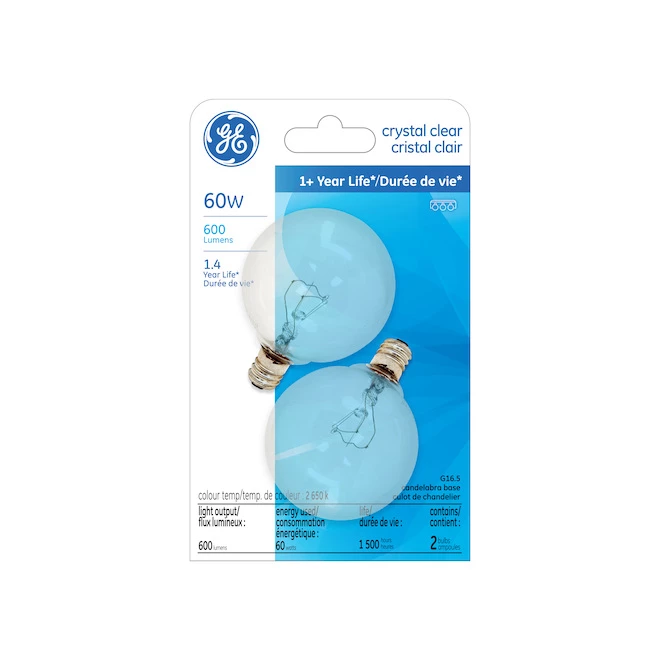 Crystal Clear 60-watt clear finish G16 globe light bulbs illuminate your home with soft, pleasing incandescent light. They are dimmable to provide just the right brightness. Crystal Clear G16 light bulbs are rated to last 1.4 years based on 3 hours per day use. Use these incandescent G16 (2 In. diameter) globe light bulbs with a candelabra base in dimmable indoor bathroom vanity lights, makeup mirrors and pendant lighting.