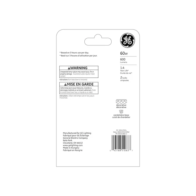 Model Description :GE Soft White 60W Incandescent Dimmable Decorative Candelabra Base G16.5 Light Bulb (2-Pack)