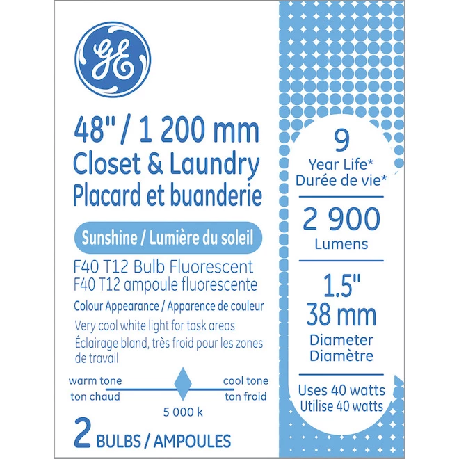 GE’s 40-Watt T12 Sunshine light bulbs provide very cool white light so you can get organized u whatever the task at hand. These bulbs are best for laundry rooms and closets.