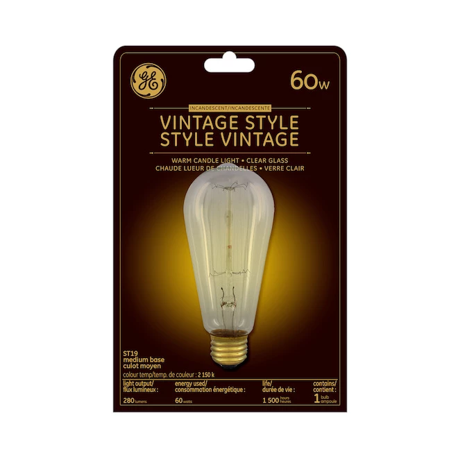 Vintage Style 60-Watt Clear Finish ST19 incandescent light bulbs replicate the retro look of antique incandescent bulbs. A warm candlelight glow and iconic shape recreate the vintage light bulb. It’s rated to last 1.4 years based on 3 hours use per day. Use the Vintage Edison-style ST19 bulb with a medium base in dimmmable pendant lights, chandeliers and decorative fixtures.