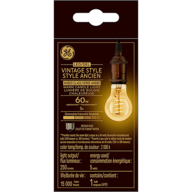 Model Description :GE Vintage Warm Candle Light 60W Replacement Amber Finish Spiral Filament A19 Light Bulb (1-Pack)