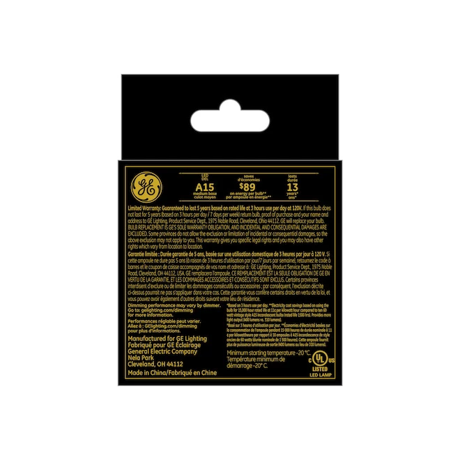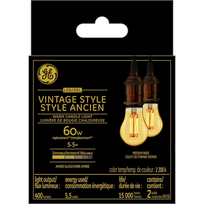 Model Description :GE Vintage Warm Candle Light 60W Replacement LED Amber Finish Straight Filament Medium Base A15 Light Bulbs (2-Pack)