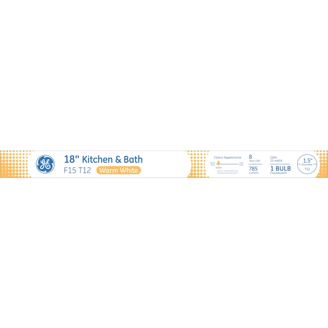 Our 15-Watt T12 Kitchen and Bath fluorescent bulbs provide warm white light. They deliver warm tones to create a comfortable and inviting atmosphere. These bulbs are rated to last 4 years based on 6 hour per day consumer use. Use these 18-inch-long fluorescent bulbs with a 1-1/2-inch diameter in living areas, kitchens and bathrooms as well as restaurants, hotels and lobbies.