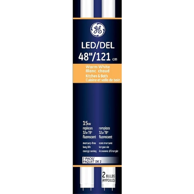 Our Kitchen and Bath Warm White T8 LED tubes replace 48-inch T8u1-inch diameterufluorescent bulbs using the existing fixture and electronic ballast. It’s slim size fits in the same fixtures as traditional 48-inch T8 fluorescent bulbs. Why make the switch to LED? Our LED tubes are rated to last 36,000 hours. They provide long 16-year life based on six hours use per day, so you’ll replace less often. They use less energy than a 32-Watt T8 with nearly the same light output helping you save money on energy. And they’re mercury free. Use Kitchen and Bath Warm White T8 LED tubes in kitchens and bathrooms to provide warm white light.