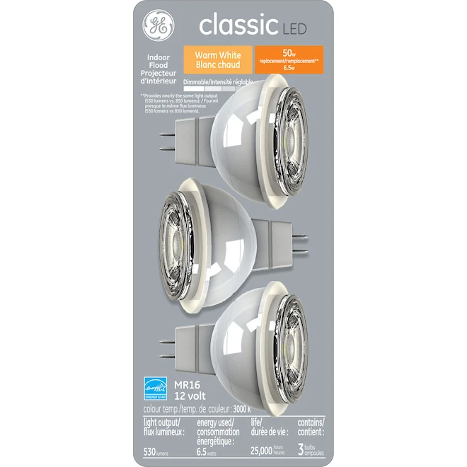 Model Description :GE Warm White 50W Replacement LED Indoor Floodlight GU5.3 Base MR16 Light Bulb (3-Pack)